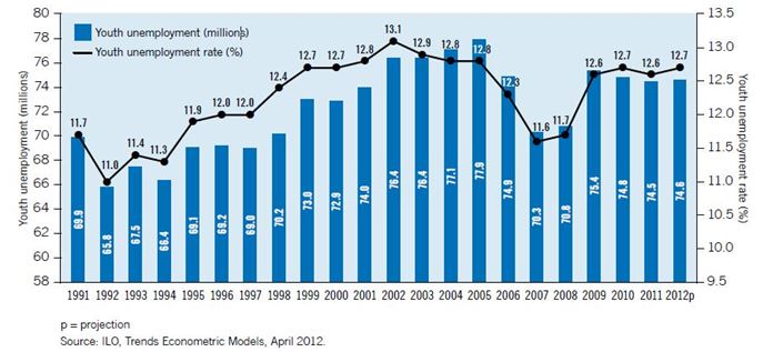Figure. Global youth unemployment and unemployment rate, 1991–2012
